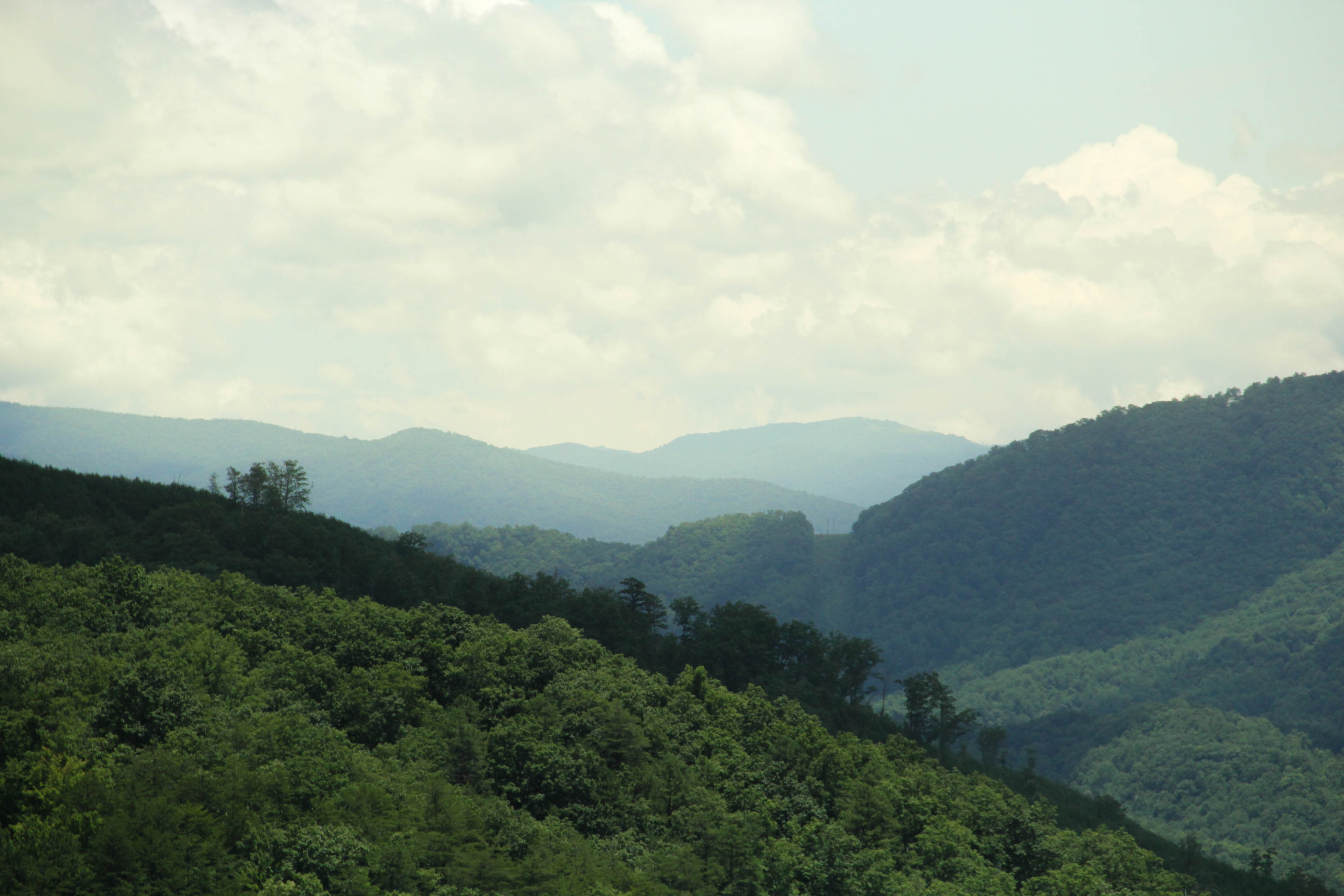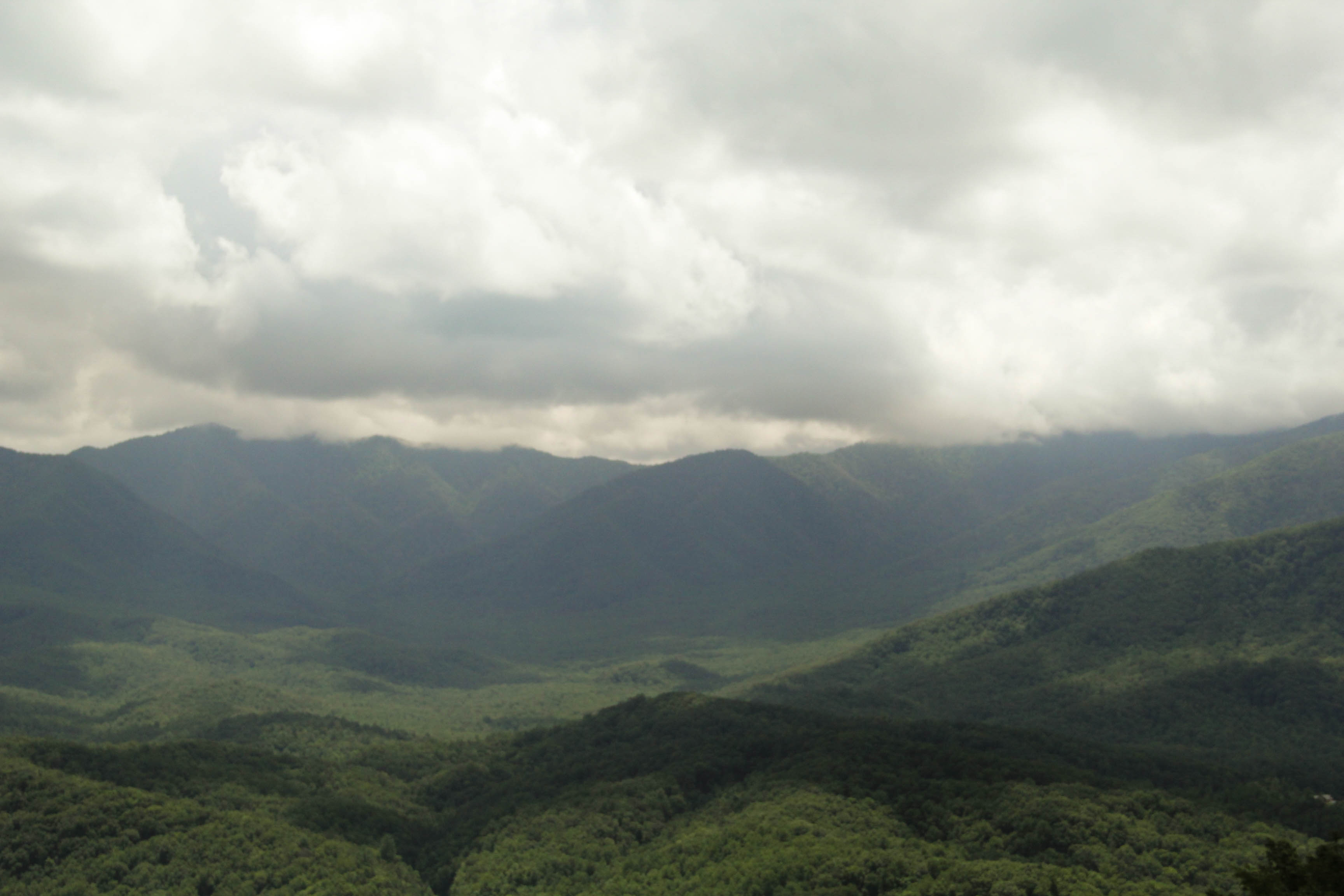 We rolled out bright and early on Sunday morning – the back of the Jeep loaded down with all our trip necessities: tent, sleeping bags, guitars, chocolate covered almond caramel clusters, etc. etc. Brilliant sunshine, rolling hills, and a million and one hilarious inside jokes; nothing could stop us now. Our 2013 USA Tour was finally happening! The eight-hour drive went by rather smoothly* and by 6:30 that evening we were rolling through the home of a thousand dinner theaters: the one and only Pigeon Forge, Tennessee. Never have I asked myself the questions “why? who? what is going on??” more than when rolling through this charming & bizarre town(?) including – but not limited to – a full-sized Titanic replica, an upside-down haunted mansion, and 8 billion larger-than-life mini-golf courses. Gatlinburg provided a similar array of entertainment and dining options. Needless to say, we were thankful to finally make it to campsite A13 in Cosby, Great Smoky Mountains.