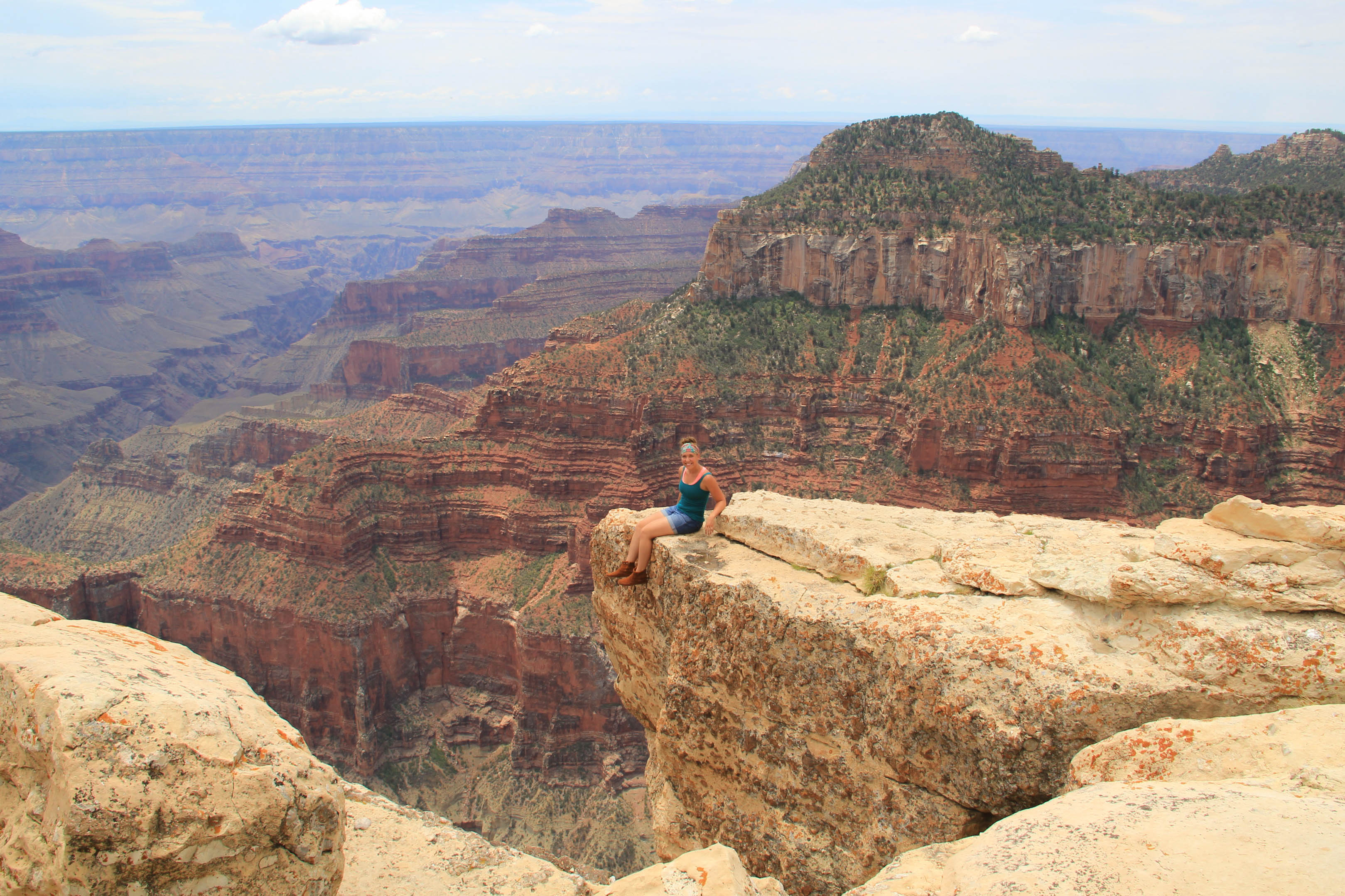 Finally, at the end of the day we drove up to a highly recommended spot called Cape Royal. We brought with us some snacks and a blanket in hopes to camp out a bit and watch the sun set over the canyon. Feeling adventurous* we climbed out over a little railing to a large rock face that hung out in space overlooking a plummeting green valley. This was what we had been waiting for. The sight was unparalleled.