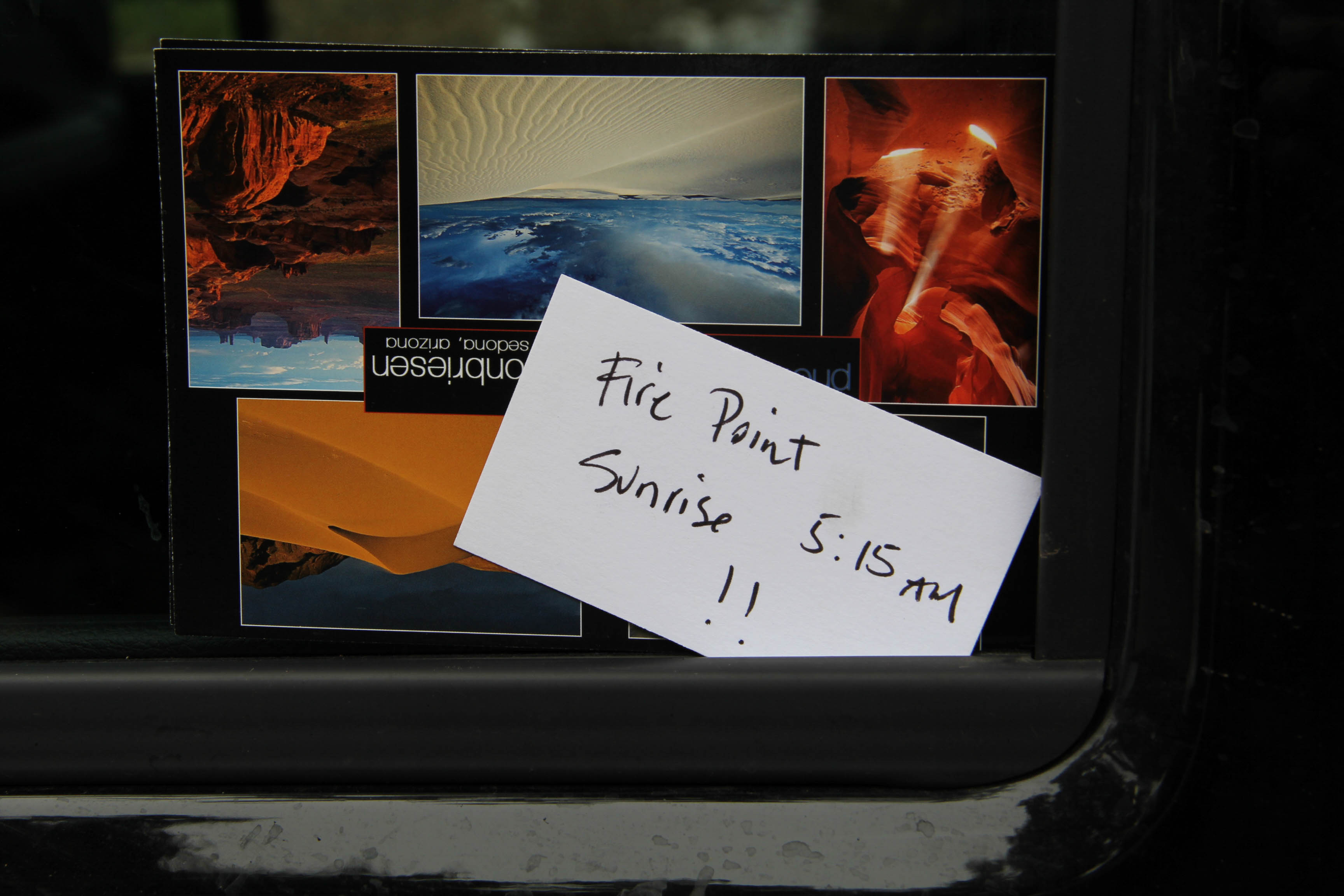 While we were there, we struck up a conversation with a nearby photographer (check out his website here – http://www.pbase.com/sedonamemories) who explained to us that where he was camping afforded matchless views of the canyon in a secluded area. Lightening across the canyon changed our sunset plans, but upon returning to the car, we found an invitation left on the window.